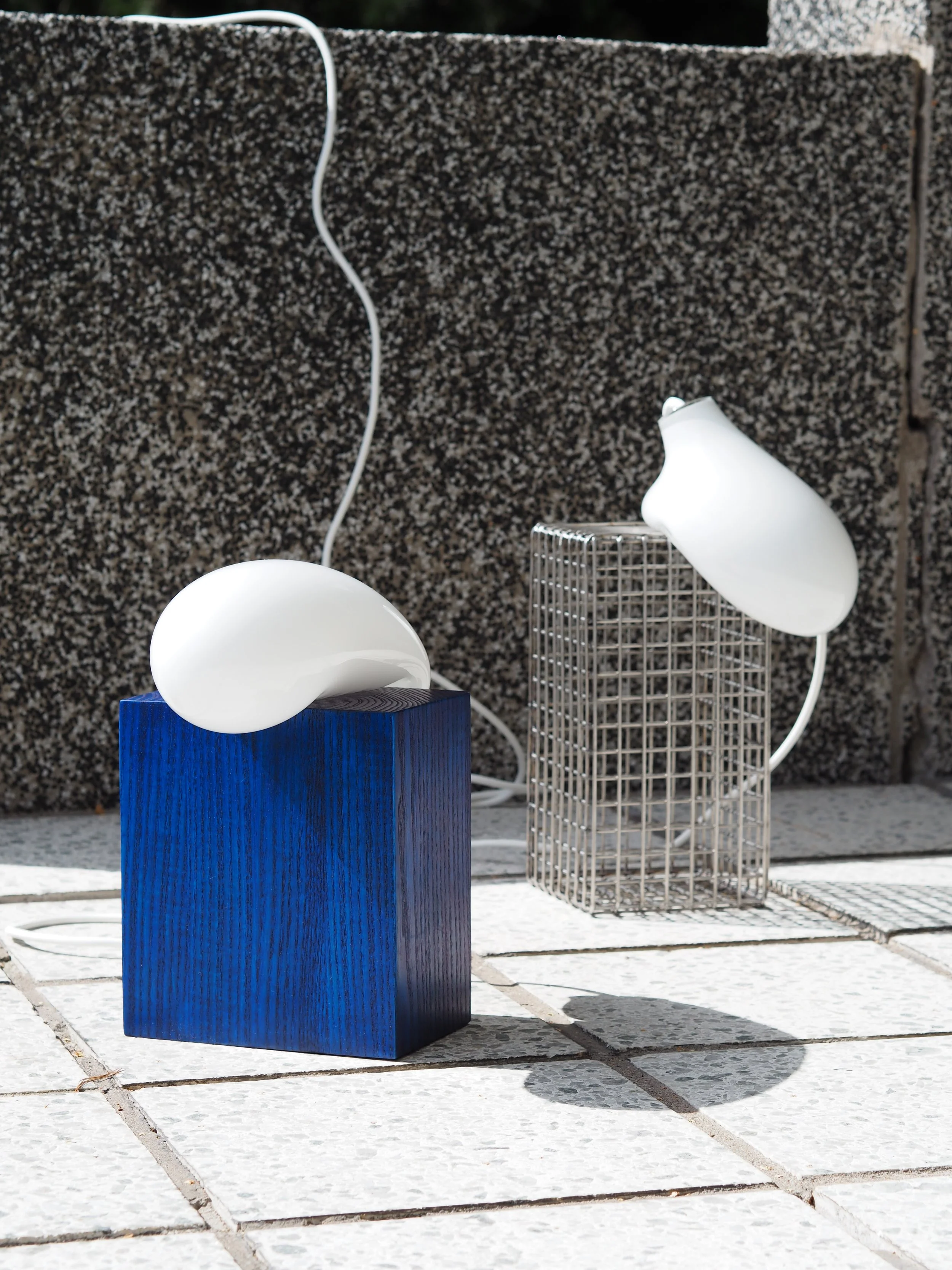 The series includes three different lights: one large piece with two light sources, one tall metal structure with a light source positioned on the corner, and one light whose source rests on a blue wooden cube.
